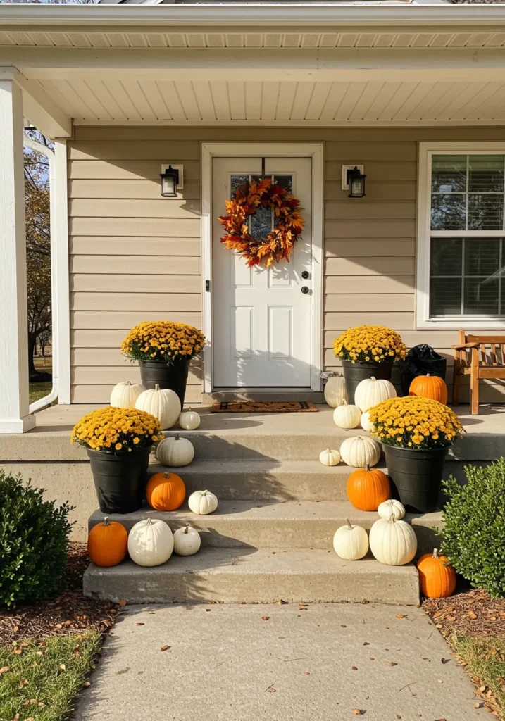 This porch is the definition of cheerful simplicity. Clusters of white and orange pumpkins line the steps, surrounded by golden mums in black pots. A fall wreath adds the perfect pop of warmth against the light siding, creating a look that feels festive yet balanced.