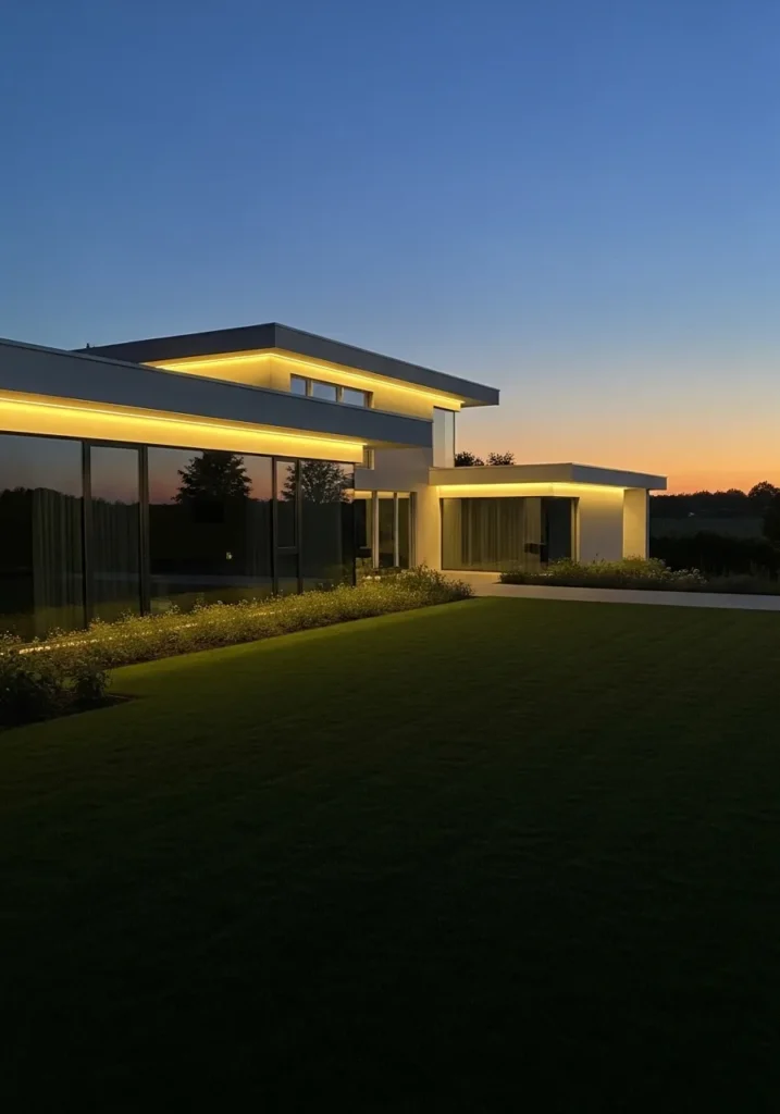 I just love how this design plays with contrast—the warm lighting against the cool evening sky is pure magic. It feels peaceful yet luxurious, like the kind of place you’d unwind with a glass of wine while your favorite Christmas playlist hums in the background. The subtle glow makes it feel festive in the most modern, understated way, and I honestly can’t stop staring at it.