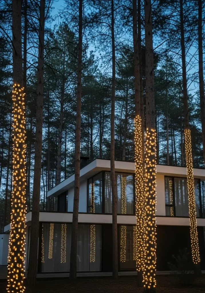 This stunning modern home feels like it’s hiding in an enchanted forest. The sleek black-and-white architecture is framed by tall pine trees wrapped in soft golden fairy lights that twinkle like stars between the branches. The wide glass windows reflect the gentle sparkle, blending the crisp geometry of the house with the warmth of the glowing forest around it. It’s the perfect blend of contemporary design and natural charm, where every light seems to whisper winter serenity.