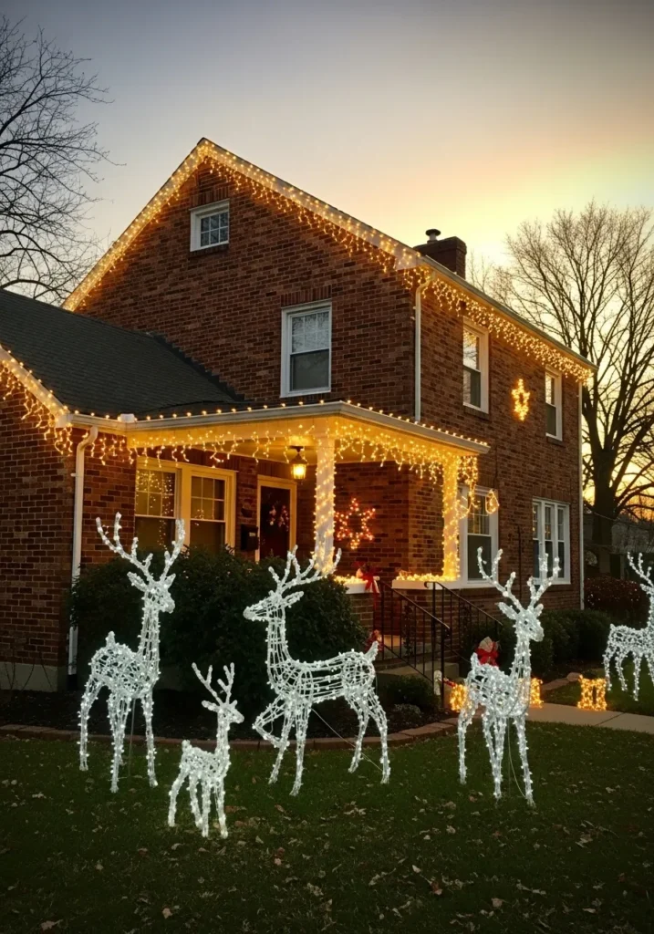 This charming brick home has that timeless, storybook look that makes you instantly think of cozy Christmas memories. The warm amber lights trace the roofline in perfect symmetry, while soft icicle strands drape gracefully from the porch eaves. Out front, a little family of glowing reindeer steals the show, their twinkling frames looking like they just stepped out of a winter fairy tale. The soft golden light bouncing off the red brick gives the whole house a rich, welcoming warmth that feels both traditional and festive.