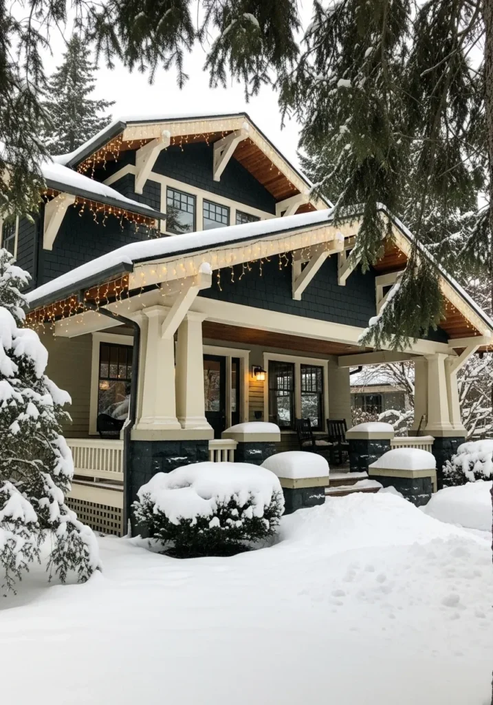 Snowy Craftsman Porch with Golden Icicle Lights