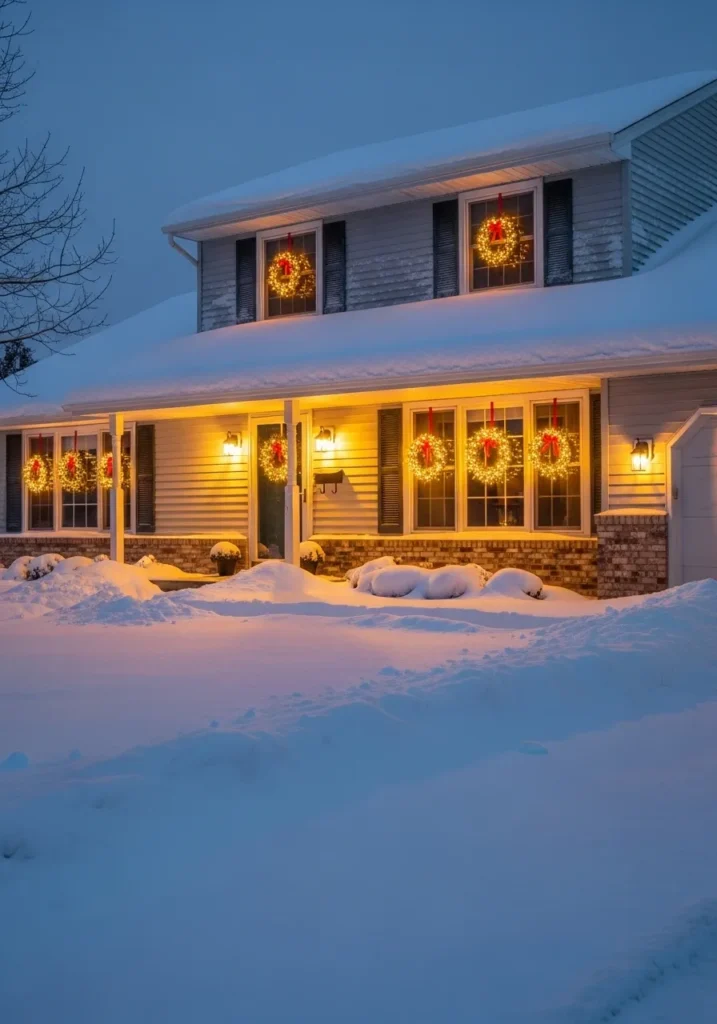 This two-story home looks like it’s straight out of a cozy Christmas movie scene. The exterior is wrapped in a blanket of soft snow, and each window glows with a golden wreath twinkling gently in the evening light. The wreaths are perfectly spaced, each tied with a red ribbon that pops against the white siding and dark shutters. The porch lighting adds a warm amber hue that makes the whole house feel like a glowing lantern in the winter night.