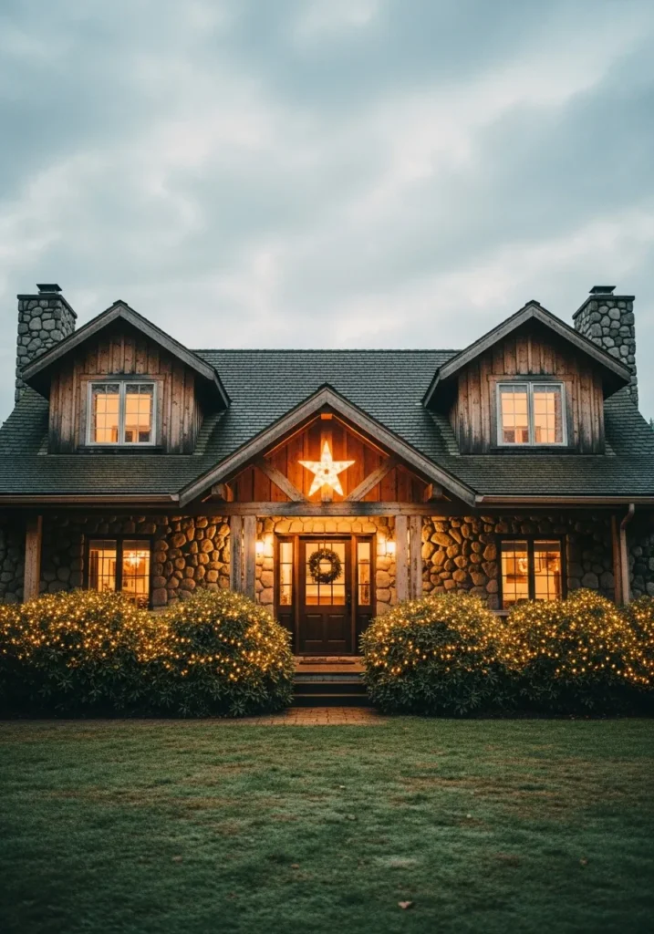 This cozy cabin feels like something straight from a holiday movie, with its warm stone exterior and soft golden lights twinkling across the bushes. The wooden beams, gabled roof, and glowing star above the front door give it that storybook charm that makes you imagine snowflakes drifting down and the smell of hot cocoa wafting through the air. The simple wreath on the door ties the whole look together in the sweetest, understated way.