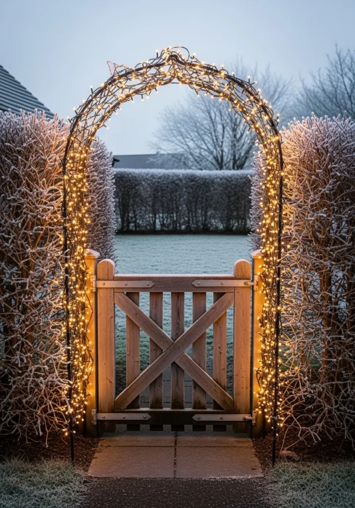 I love how this design balances elegance and simplicity. The glowing archway feels like a portal to a storybook winter evening, and honestly, I can almost hear the crunch of snow under my boots just looking at it. It’s such a beautiful reminder that sometimes, the simplest touches—like fairy lights and a perfectly framed gate—can turn an ordinary yard into something breathtaking.