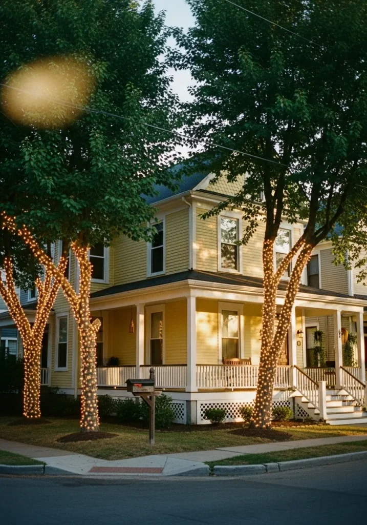 This charming two-story yellow house feels like something straight out of a small-town Christmas movie. The wraparound porch, crisp white trim, and classic rocking chairs give it that perfect nostalgic feel. But what really makes it shine are the trees out front wrapped head to toe in warm white string lights, casting a cozy glow that spills across the lawn and sidewalk. It’s the kind of scene that makes you want to grab a cup of cocoa and watch the world go by.