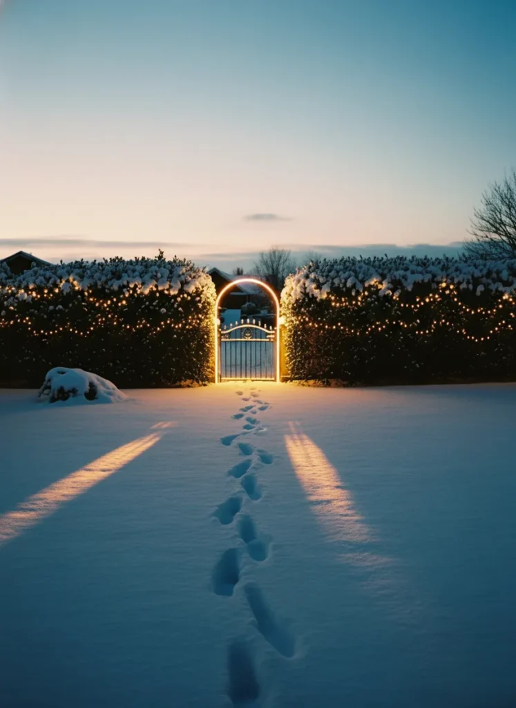 There’s something so magical about this snow-covered garden path leading to a softly glowing gate. The trimmed hedges are dusted with snow and wrapped in warm golden lights, creating the dreamiest entrance that looks straight out of a Christmas movie. The footprints in the fresh snow make it feel cozy and lived-in, like someone just stepped out to admire the twinkle of their handiwork at dusk.