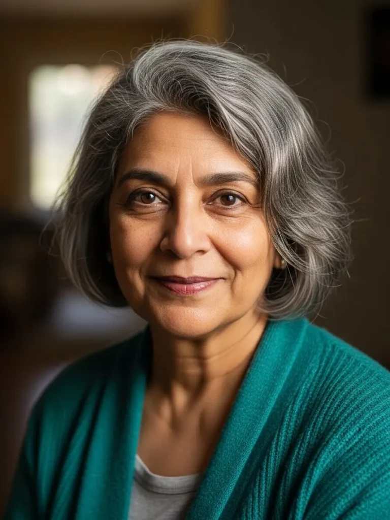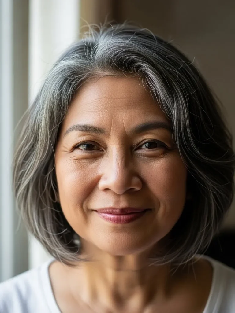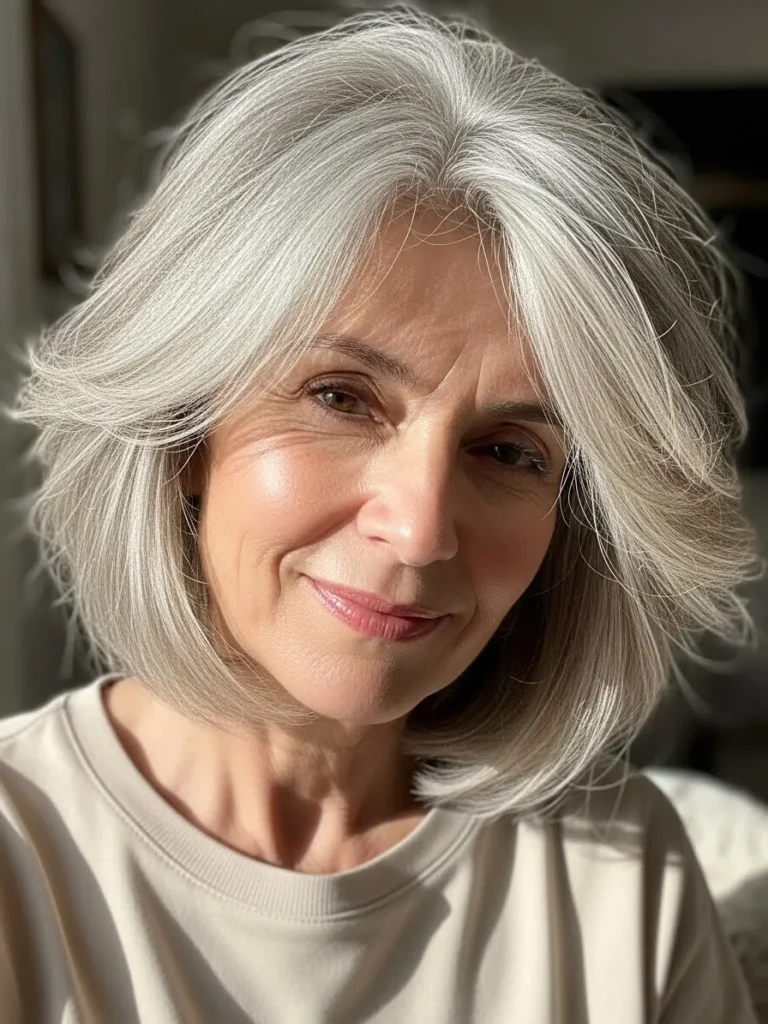 I adore how this cut enhances natural silver tones in the most graceful way. The soft curve at the ends gives my face a gentle framing and the layering helps everything feel lighter. It is a style that feels refined without being fussy.