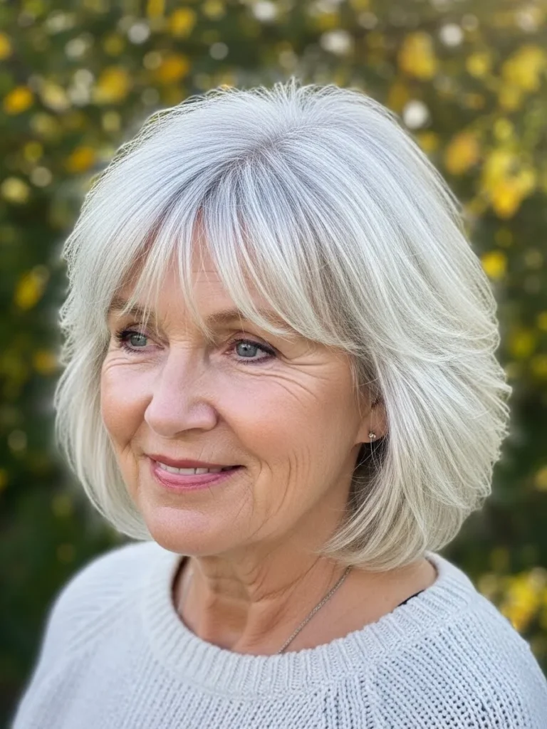 I find that this cut makes my hair feel fuller without needing constant styling. The gentle lift at the roots brightens my features and the soft silver shade always feels chic. It is a style that ages gracefully right along with me.