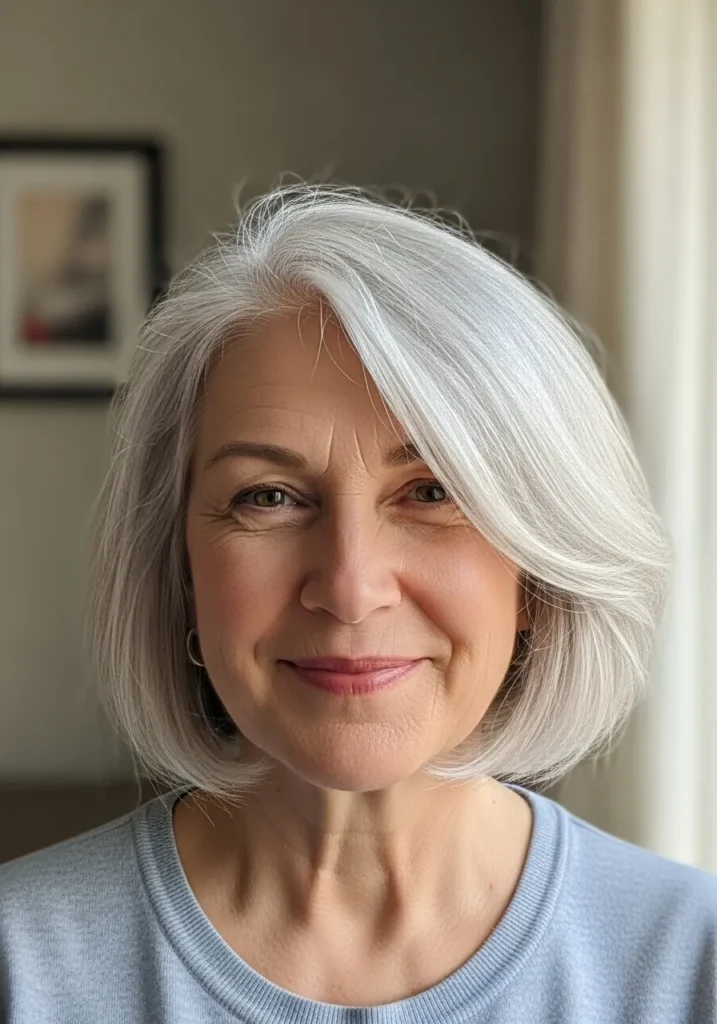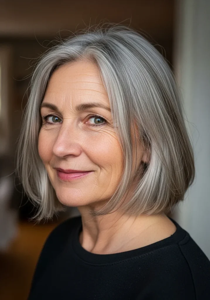 This bob falls neatly at the chin with a smooth shape that keeps the style refined. The gray shade has natural dimension which adds softness. The texture is gentle and the ends curve slightly which gives the haircut a graceful finish.