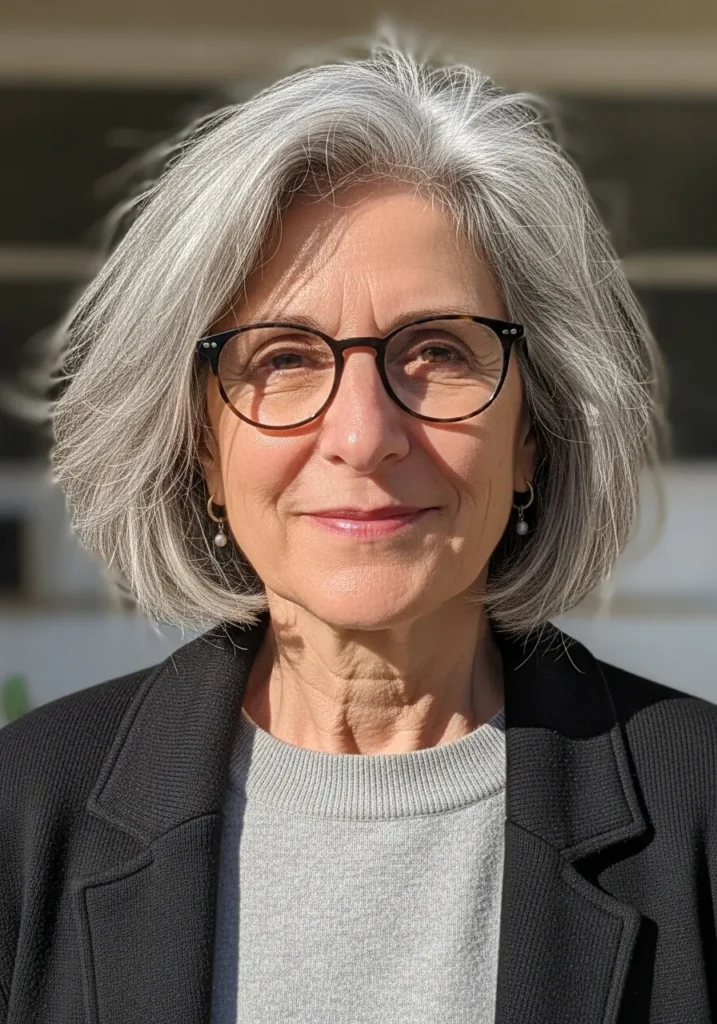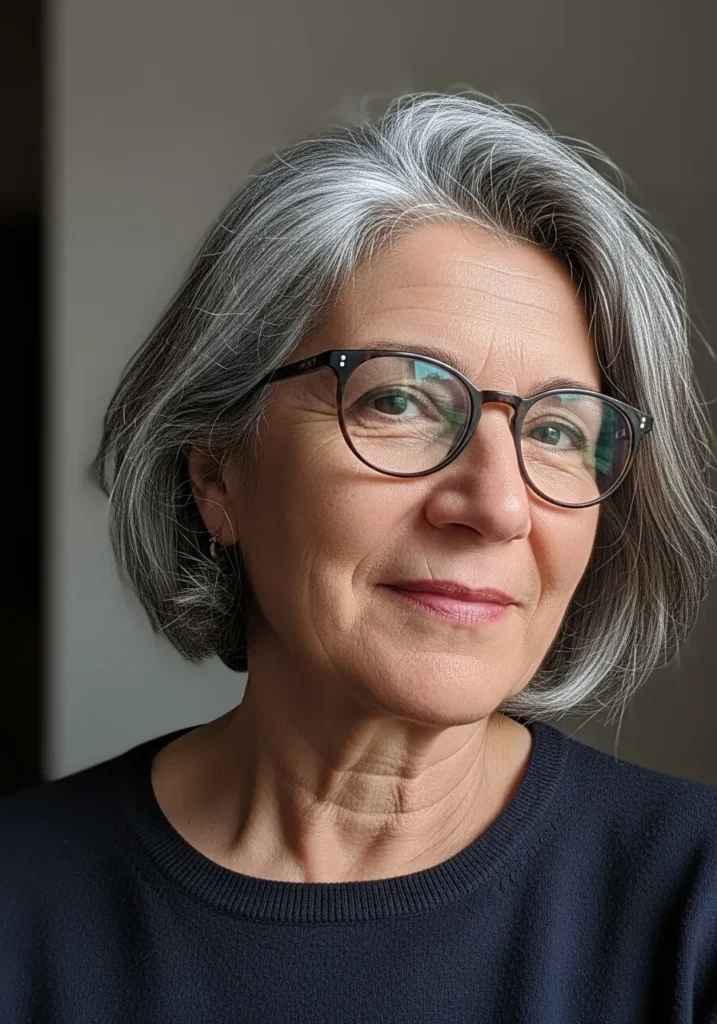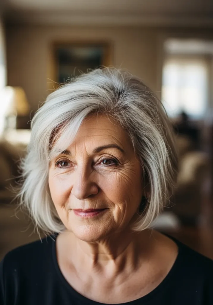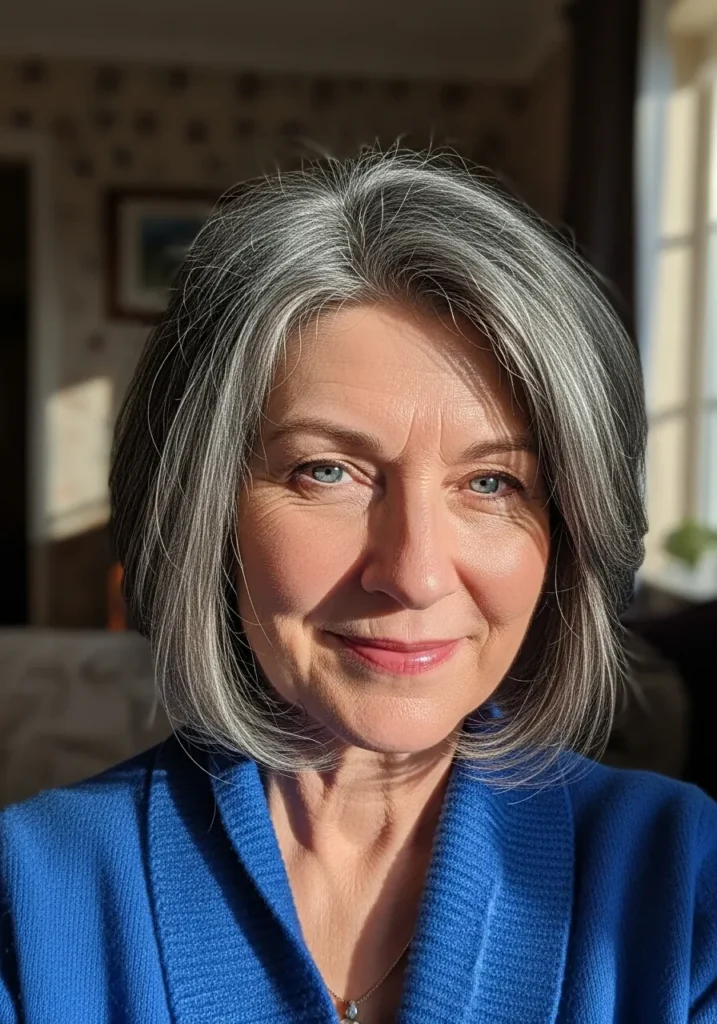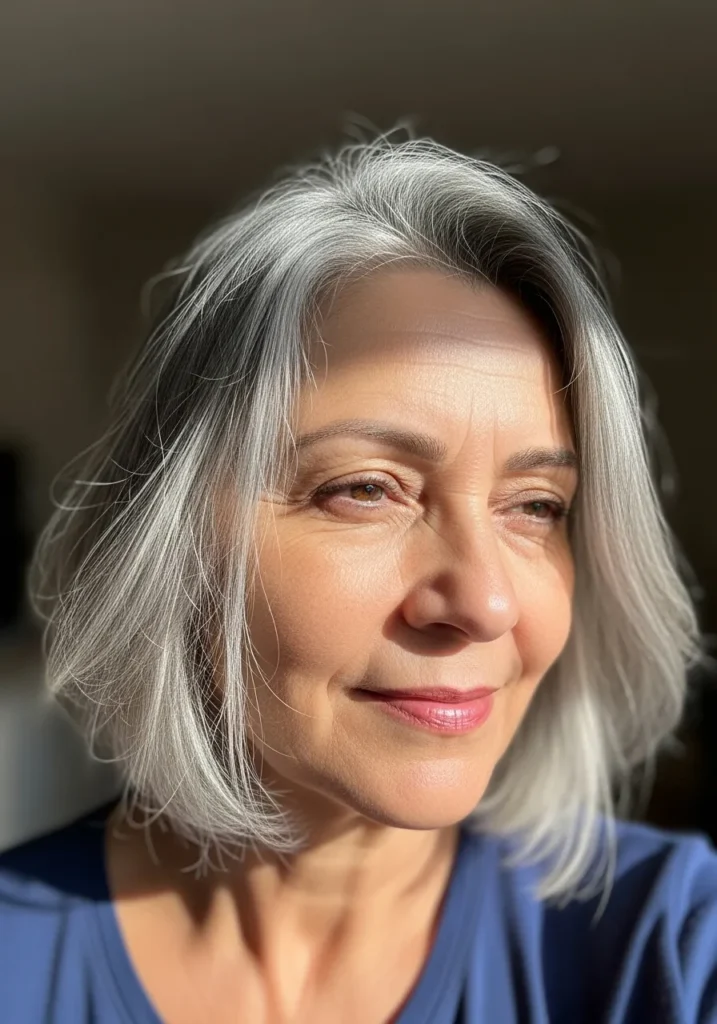 This bob has a breezy shape with gentle layers that lift the hair just enough to create soft movement. The length sits around the chin and the silver strands blend beautifully with deeper gray pieces underneath. The texture feels light and touchable which gives the whole look a relaxed charm.