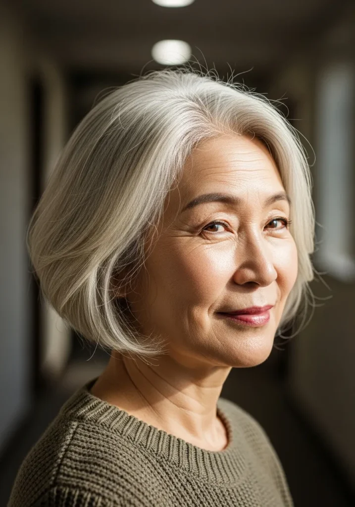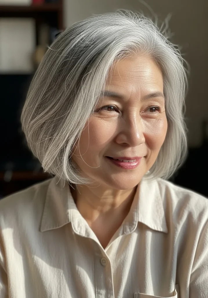 This bob has a weightless look thanks to the fine layers sweeping toward the face. The length hits the chin and the soft gray tone stays cool and elegant. The texture is subtle which keeps the cut refined but never flat.
