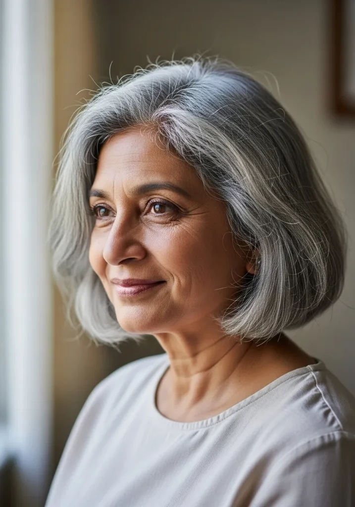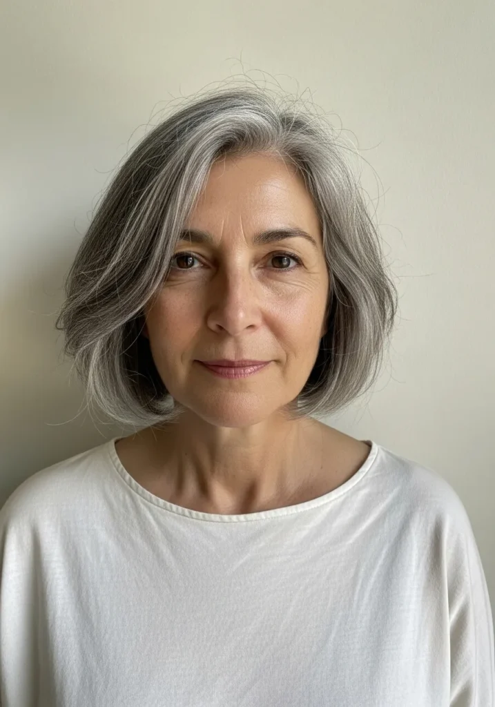 This bob has a light fullness near the top and moves softly toward the jawline. The strands are smooth with natural texture and the gray shade blends beautifully with deeper tones underneath. The overall shape feels calm and balanced.