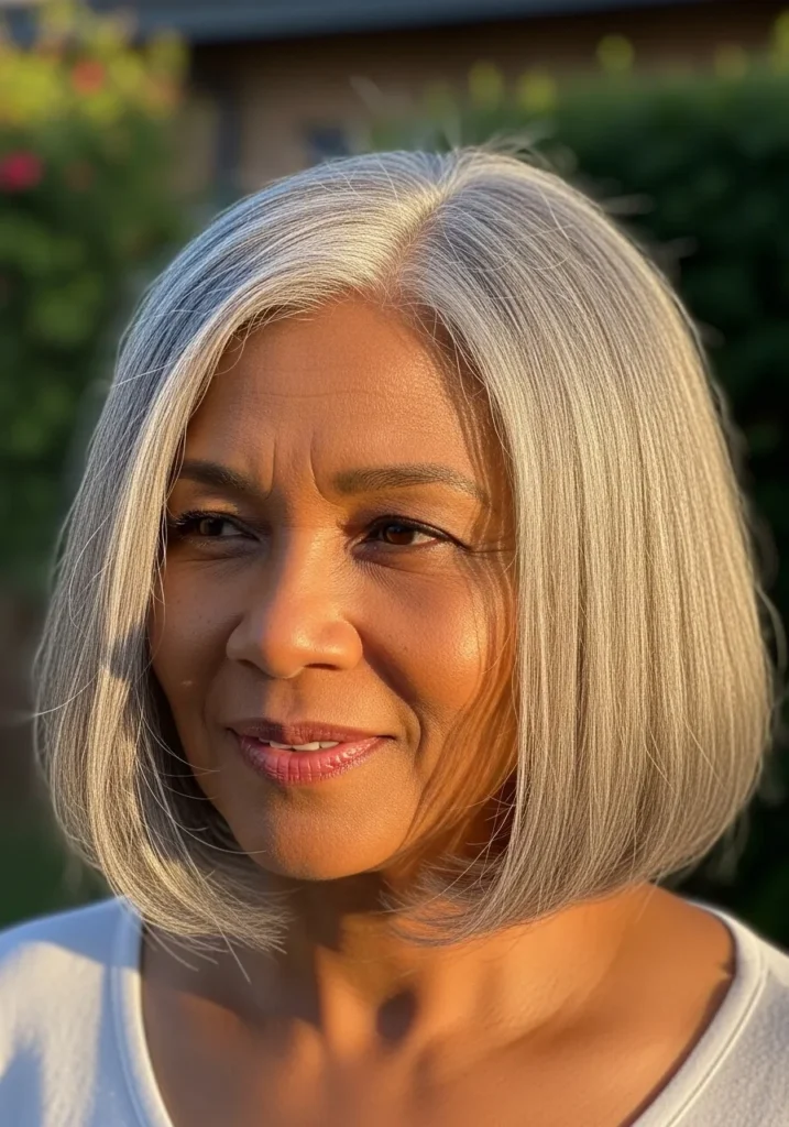 This bob has a smooth, clean outline that falls neatly at the jaw. The silver shade looks bright and glossy especially in the warm outdoor light. The texture stays sleek while the ends have a soft curve that keeps the style from feeling strict.