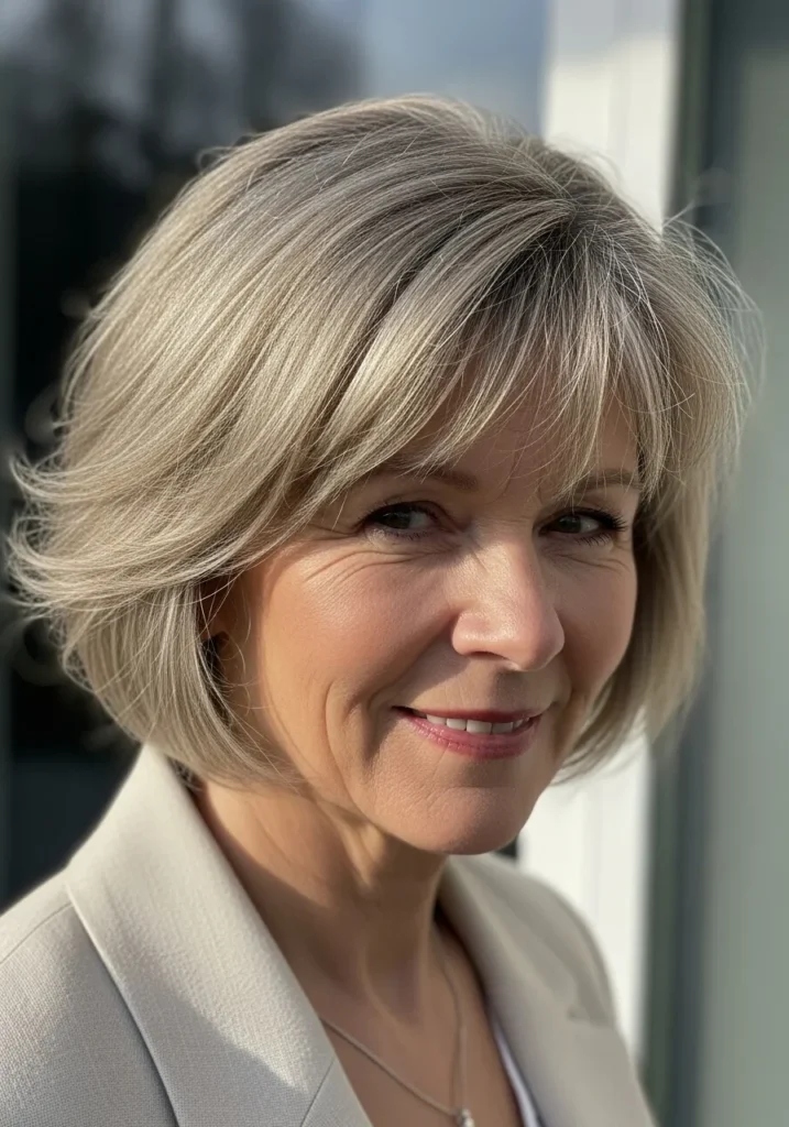 This bob has delicate layers that add movement and a soft fringe that blends into the sides. The beige toned gray feels warm and luminous. The length stays around the chin and the texture keeps everything light and airy.