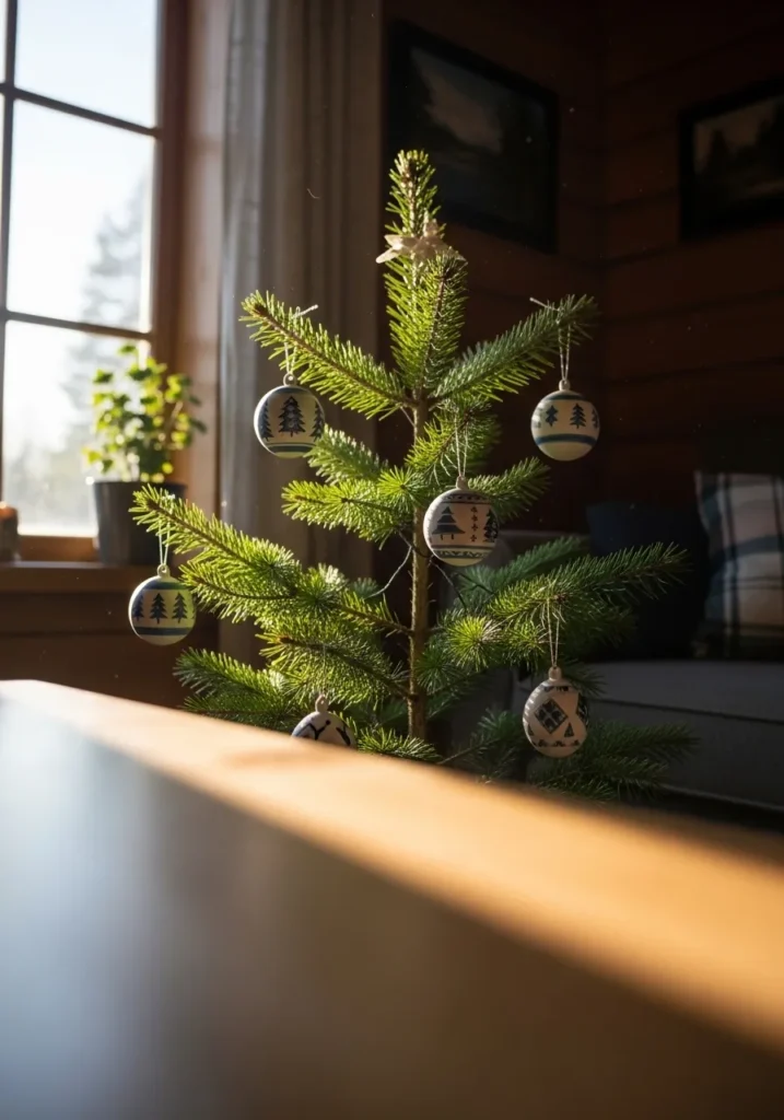 This sweet little evergreen stands tall in a sunlit corner, dressed in hand painted ornaments featuring trees and simple blue patterns. The natural light streaming through the window gives the whole room a peaceful glow, and the minimal decorations make the space feel calm and uncluttered.