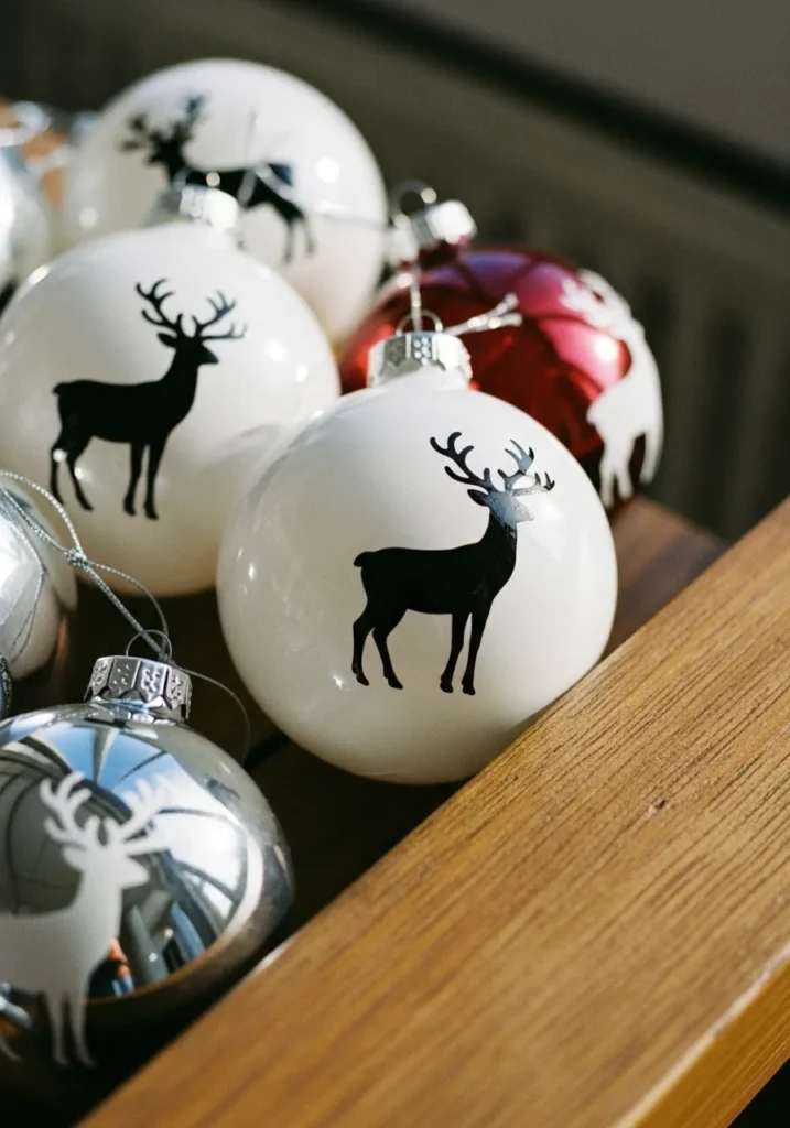 These glossy ornaments feature clean silhouettes of reindeer in black and white, with a single red bauble adding a bold pop of color. The simple designs give a modern edge while still keeping that cozy Christmas warmth.