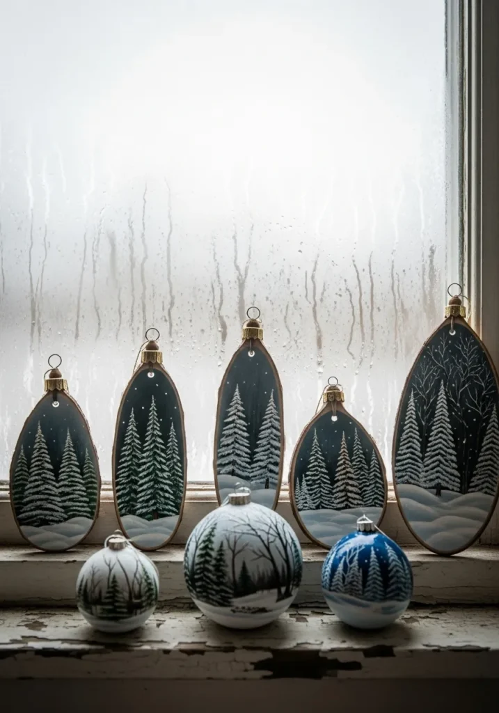 Painted ornaments in shades of green, white, and blue line a frosty window ledge, each one depicting peaceful evergreen trees under snow. The condensation on the glass adds to the cozy, wintry atmosphere, making the scene feel serene and nostalgic.