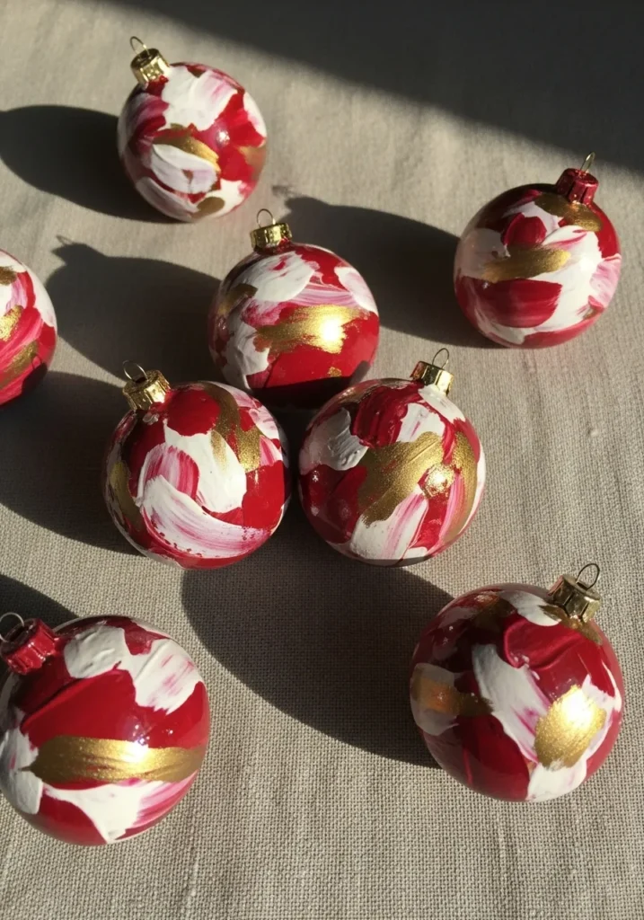 Each ornament bursts with red, white, and gold brushstrokes that feel modern and expressive. The colors dance across the surface in imperfect swirls that make every piece unique.