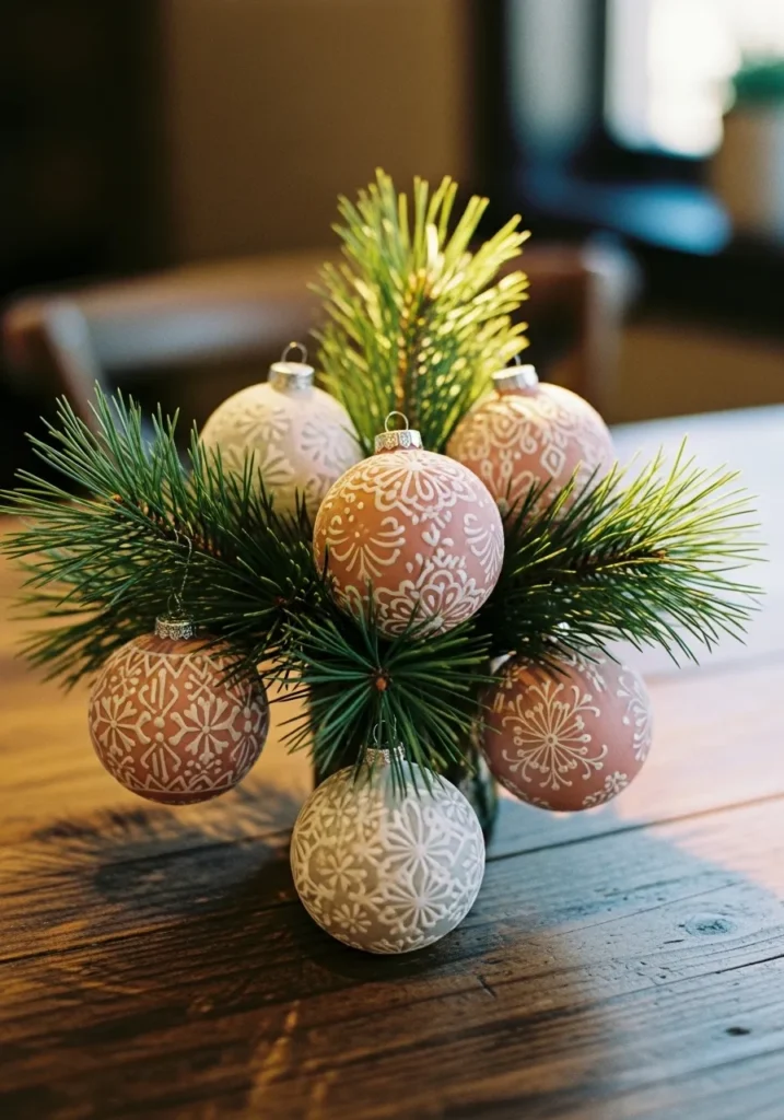 A small bunch of pine branches is gathered in a vase, holding hand painted ornaments in soft neutral tones with delicate white snowflake designs. The combination of greenery and muted colors gives it a natural, rustic charm.