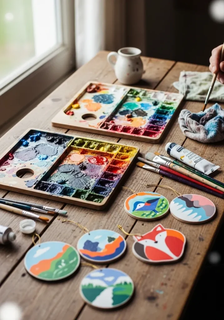 A rustic wooden table is scattered with colorful paint palettes, brushes, and hand painted ornaments featuring bright landscapes and playful woodland animals. The sunlight through the window adds a soft glow, highlighting the vivid hues and textured brushstrokes that make each piece one of a kind.