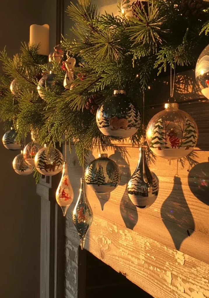 Glass ornaments painted with snowy forests and woodland animals hang from a lush pine garland draped across a rustic mantel. The golden hour light streaming in makes the glass shimmer and the painted details glow with warmth and depth.