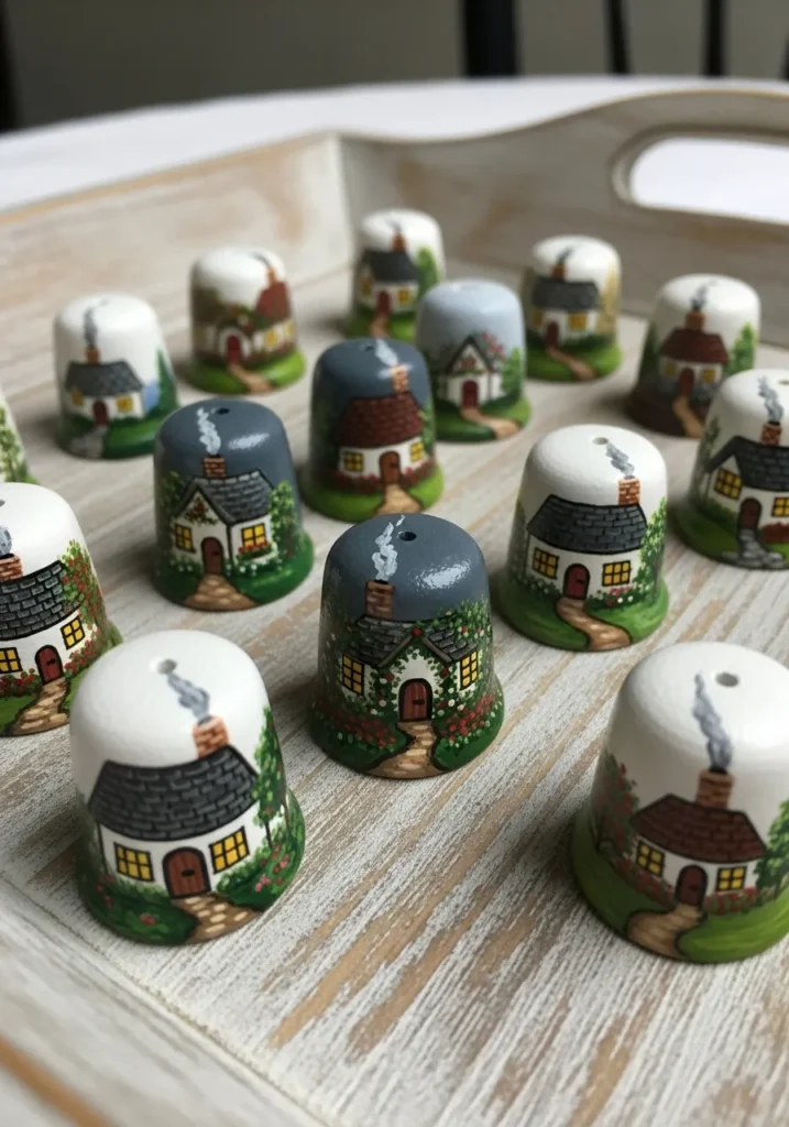 Each miniature cottage ornament is hand painted with adorable details—chimneys puffing smoke, bright windows, and winding garden paths. Set neatly on a wooden tray, they look like a tiny village ready for Christmas night.