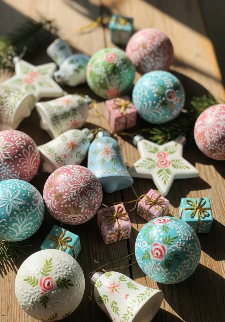A cheerful mix of pastel ornaments fills the scene, each hand painted with delicate floral patterns in pink, blue, green, and cream. Tiny gift boxes wrapped in coordinating colors complete the setup, making it look like a page straight out of a vintage Christmas storybook. The soft sunlight brings out every brushstroke and intricate detail.