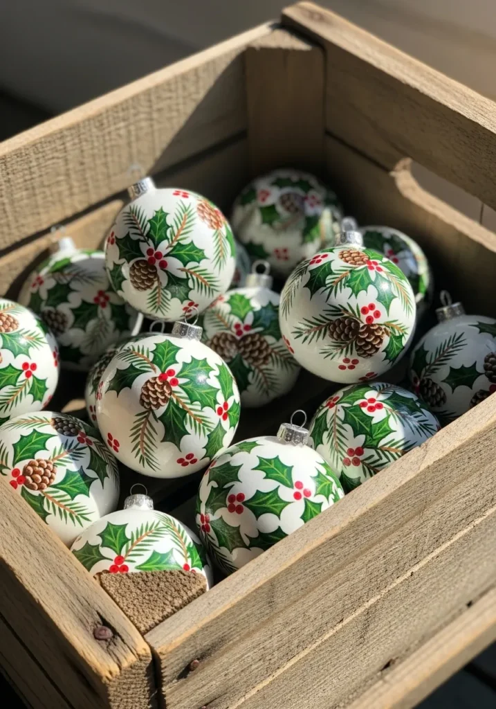 A wooden crate filled with glossy white ornaments painted with holly leaves, berries, and pinecones feels perfectly traditional. The colors pop against the wood grain, making each ornament look handcrafted and full of holiday cheer.