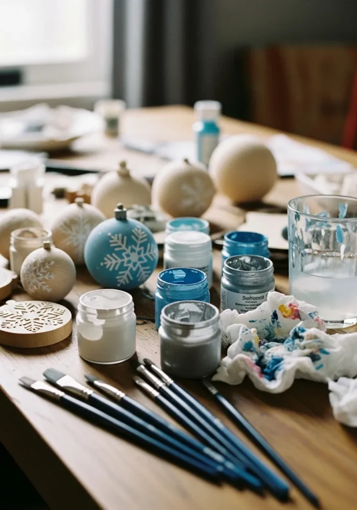 Paintbrushes, jars, and half-finished ornaments scatter across a wooden table, creating a scene that’s full of life and creativity. Shades of blue, silver, and white peek through, hinting at the magic in progress as each ornament gets its own touch of personality.
