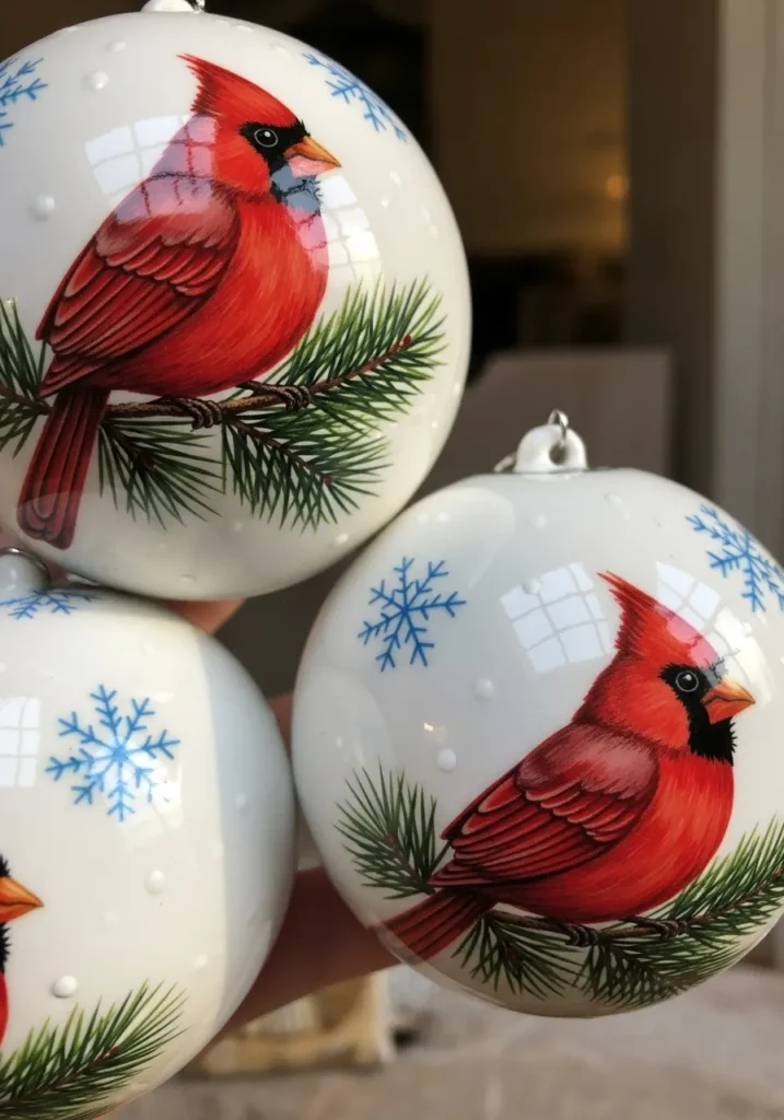 These glossy white ornaments feature hand painted red cardinals perched on evergreen branches, surrounded by tiny blue snowflakes. The rich reds against the soft white background make the design pop in the most cheerful way.