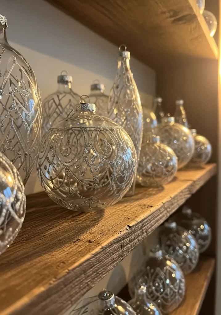 These transparent glass ornaments shimmer with intricate silver swirls that catch the light beautifully. Arranged neatly on rustic wooden shelves, they give off a timeless charm, blending elegance with a hint of old-world craftsmanship. The clear glass and detailed glitter design create a soft, magical glow when the sunlight hits them just right.