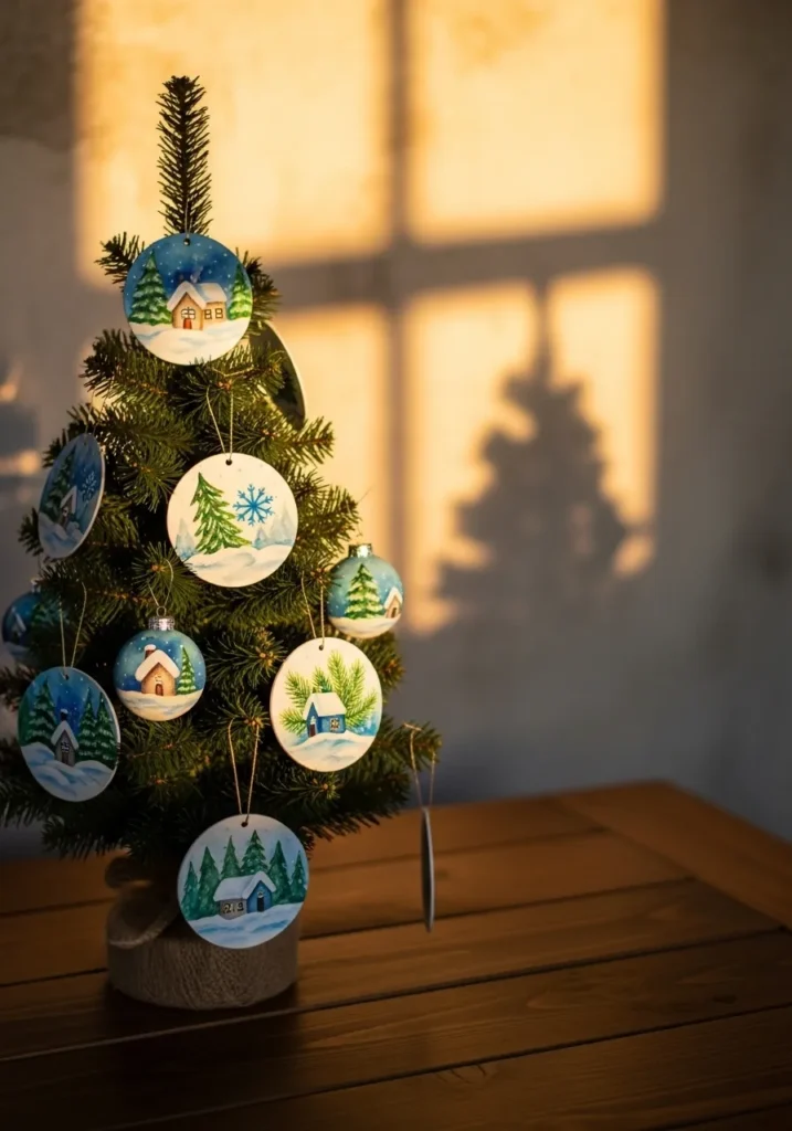 A small Christmas tree sits on a wooden table, glowing in warm evening light. Each ornament is hand painted with tiny cottages, snowy forests, and delicate blue snowflakes that look magical against the soft green needles.