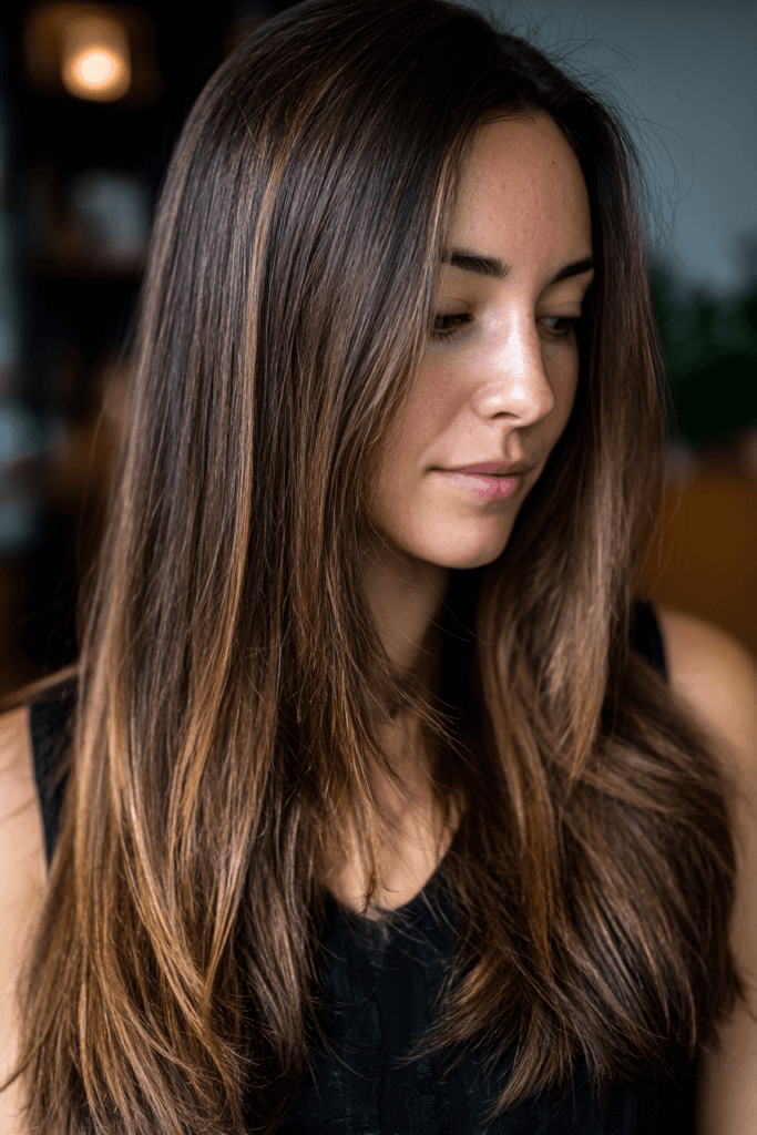 I am a total sucker for this kind of dimensional color because it makes long hair look so much more interesting than a solid flat shade. It feels extremely flattering because those lighter caramel pieces around the face act like a spotlight for your features and give your skin a warm glow. If you have been wanting to experiment with color but are afraid of a high maintenance upkeep, this lived in balayage is the perfect way to go. It is the ultimate “I woke up like this” style that still feels completely polished and chic.