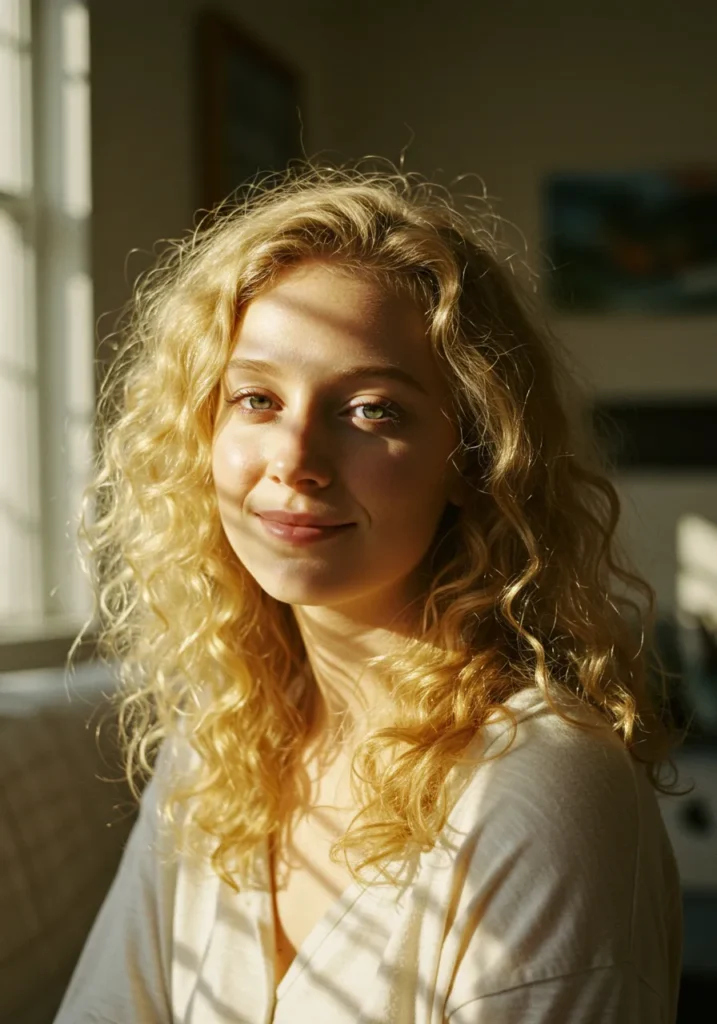 This hairstyle is full of light, airy curls in a golden blonde tone that catches the sunlight perfectly. The natural curl pattern gives it bounce and personality, with soft volume around the crown. It’s warm, radiant, and effortlessly beautiful — almost glowing in the light.