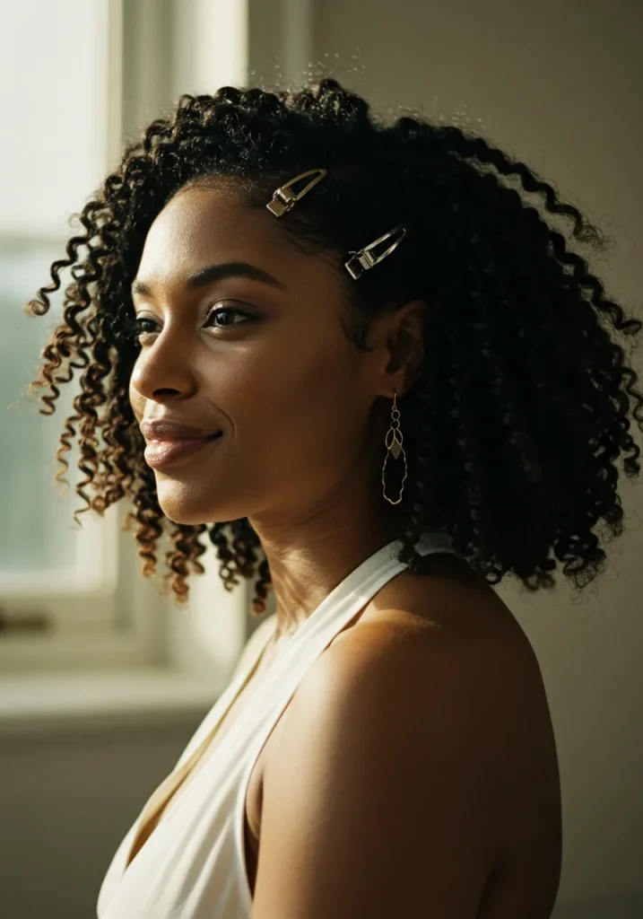 This style celebrates natural curls with a defined, springy texture that’s full of body and bounce. The hair is shoulder-length and styled to one side with a few shiny clips adding a modern touch. The curls look healthy and soft, perfectly shaped without being too uniform.