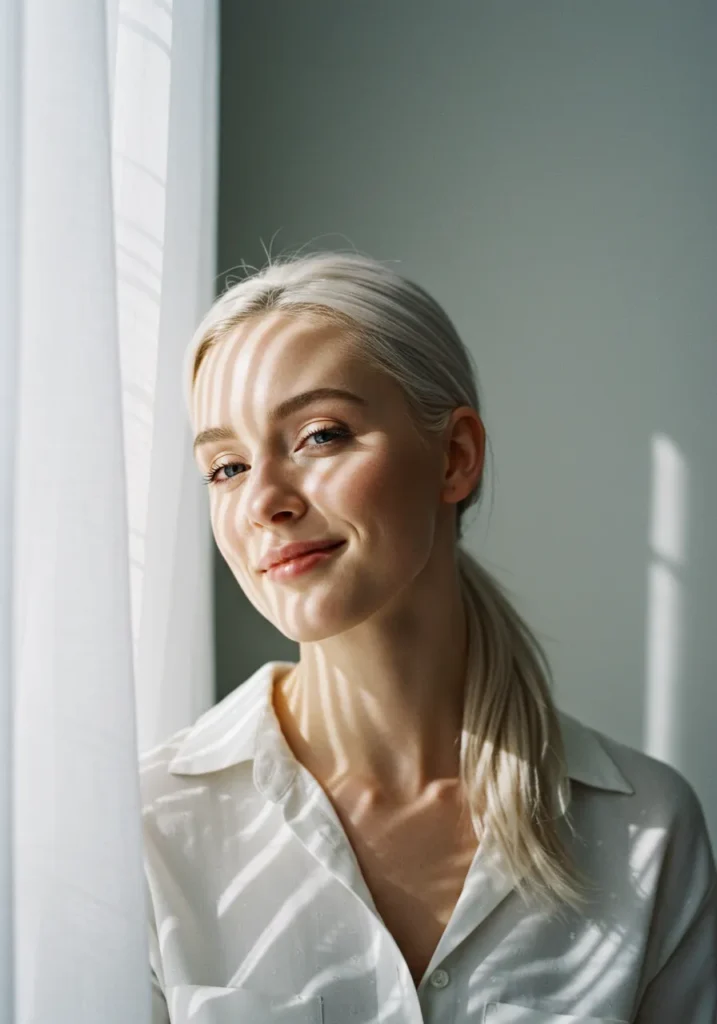 This sleek ponytail sits low at the nape, polished and smooth with a soft shine. The icy platinum shade adds a modern, crisp edge that feels fresh and cool. Strands are neatly tucked with no frizz, giving the whole look a minimalist and refined finish.