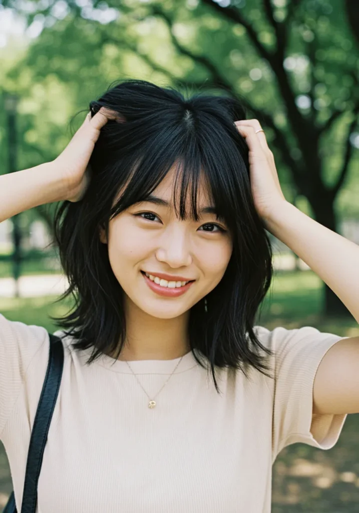 This hairstyle features a medium-length bob with soft, feathered ends and wispy bangs that gently frame the face. The dark hair has a natural shine and easy movement, giving it a fresh and carefree look. The slightly tousled texture makes it feel effortless and modern at the same time.
