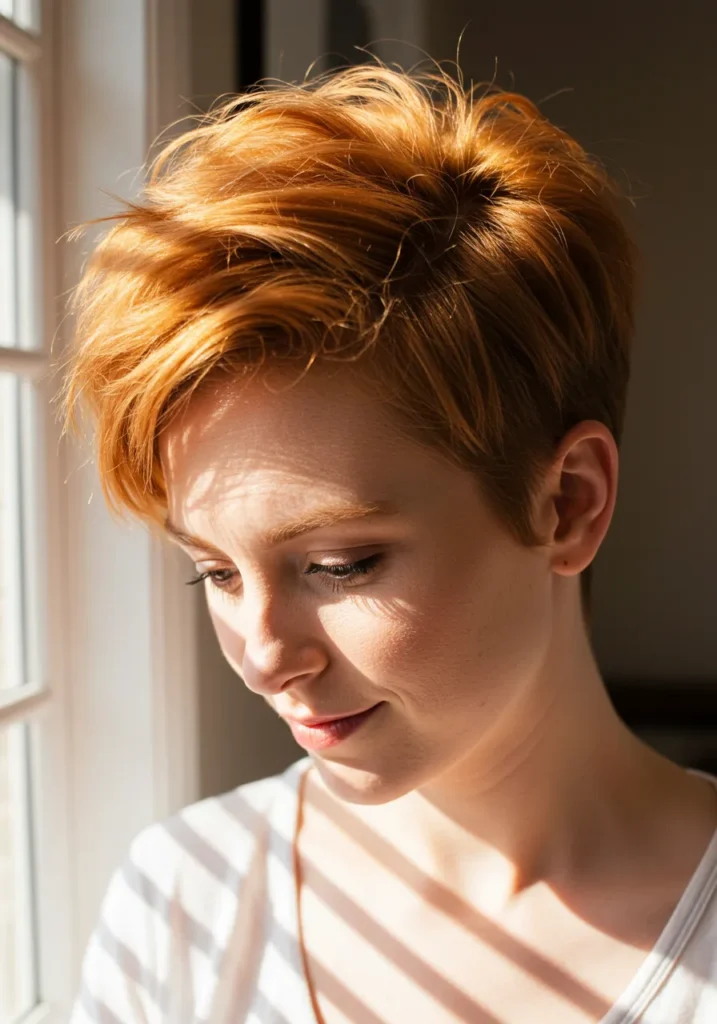 This short pixie cut is full of personality, with a soft, tousled texture that gives it a playful edge. The vibrant copper tone catches the light perfectly, highlighting every piece of movement in the hair. It’s equal parts bold and chic.