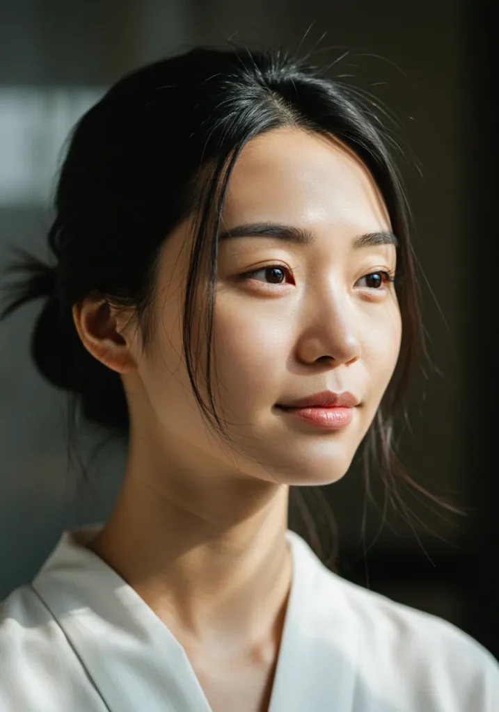 This look is all about simple elegance. The hair is gathered into a relaxed low bun at the nape, with a few soft strands framing the face for that barely-there romantic feel. The dark, glossy texture gives it a polished finish while keeping it natural and understated.