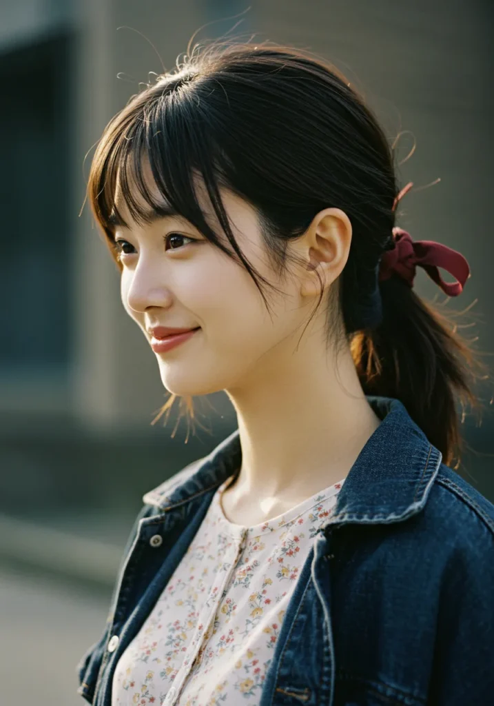 This hairstyle features a simple, low ponytail tied with a soft burgundy ribbon. The dark, shiny hair is smooth and neatly gathered, while a few wispy strands fall around the face for a soft finish. The ribbon adds a romantic, seasonal touch that feels effortlessly feminine.