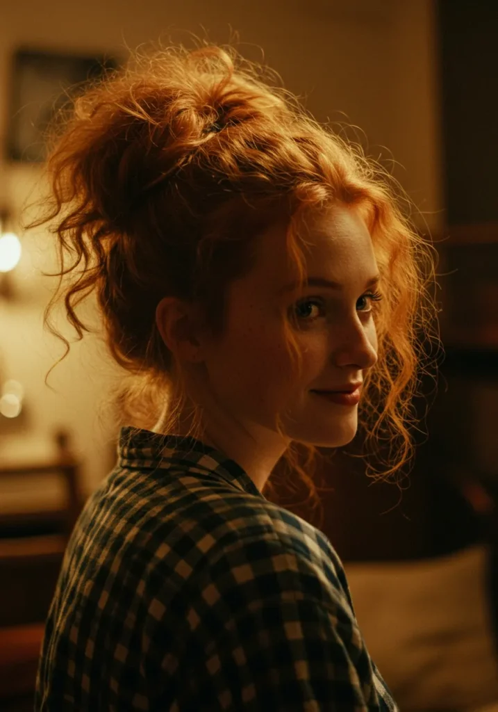 This voluminous updo features soft, fiery red curls piled high in a carefree bun. Loose tendrils fall around the face, giving it that dreamy, lived-in texture. The natural curl pattern adds personality, while the warm copper shade feels perfectly in tune with the Thanksgiving mood.