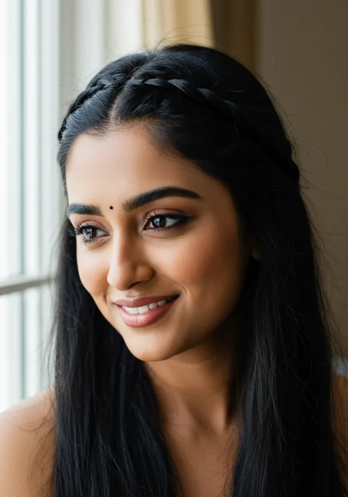 This hairstyle features smooth, jet-black hair styled into two neat braids that meet at the crown, forming a delicate halo effect. The rest of the hair flows straight and glossy down the back, framing the face beautifully. It’s neat, feminine, and timeless.