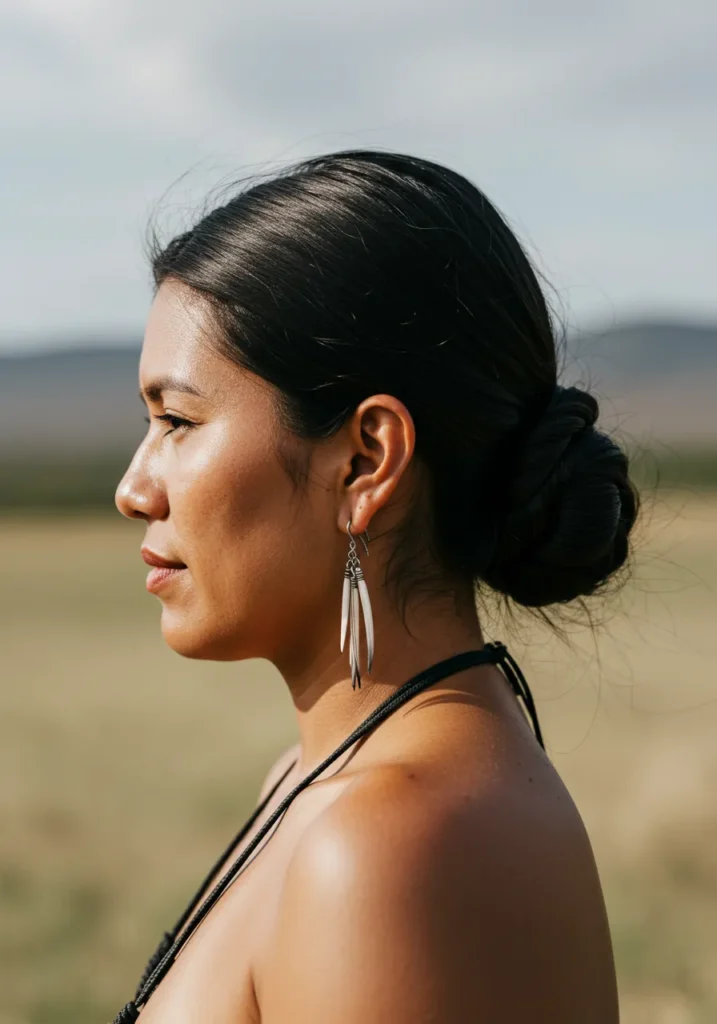 This sleek low bun is smooth, structured, and tucked neatly at the nape of the neck. The hair is parted cleanly with no frizz or flyaways, letting the glossy texture shine in the light. It’s a minimalist yet powerful look that draws attention to the face and neckline beautifully.