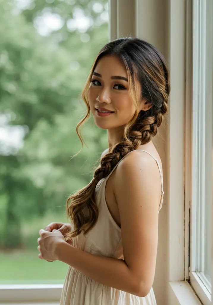 This hairstyle features a long, thick side braid that drapes softly over one shoulder. The braid begins loosely near the crown, with a few delicate curls left free to frame the face. Subtle highlights add depth and glow to the braid, making it feel feminine and graceful.
