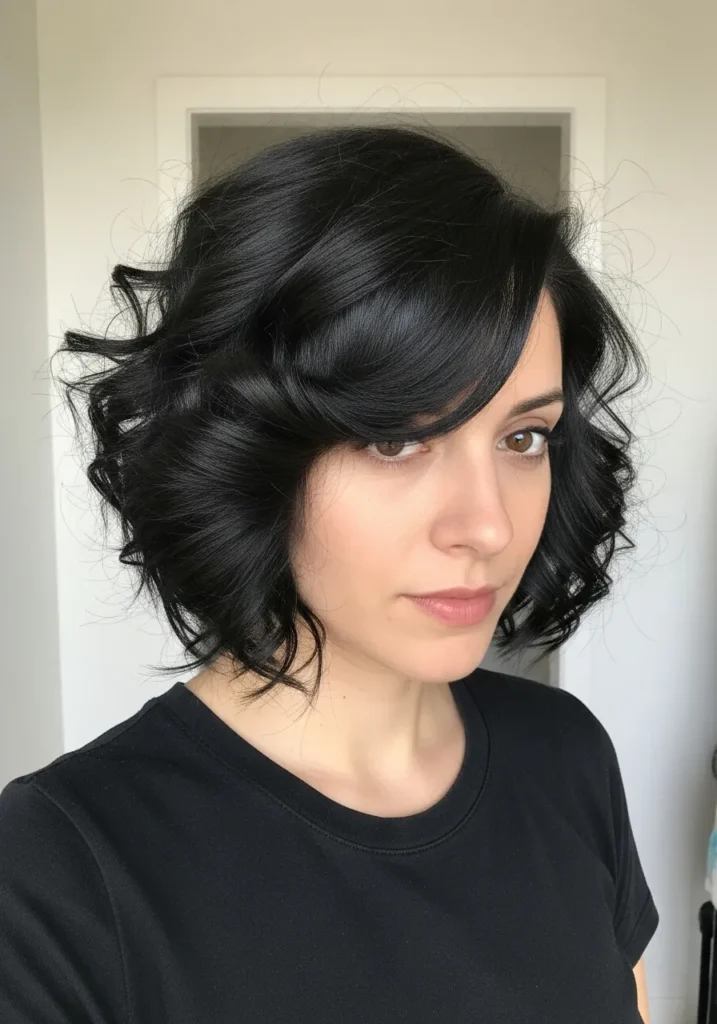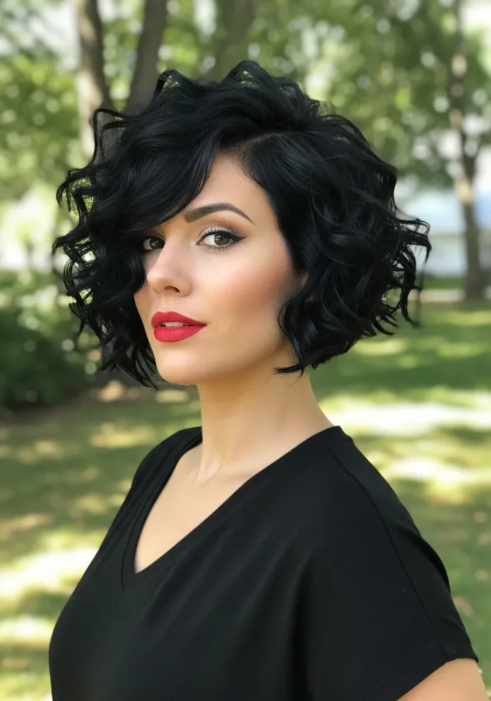 This inverted bob sits just above the shoulders and shows off glossy black curls that look impossibly smooth yet full of bounce. The shape angles slightly shorter in the back, giving the style that classic inverted silhouette. Soft waves frame the face while the long side sweep adds a playful curve across the forehead. The texture is polished yet touchable and the color is a deep inky black that makes the curls shine even more.