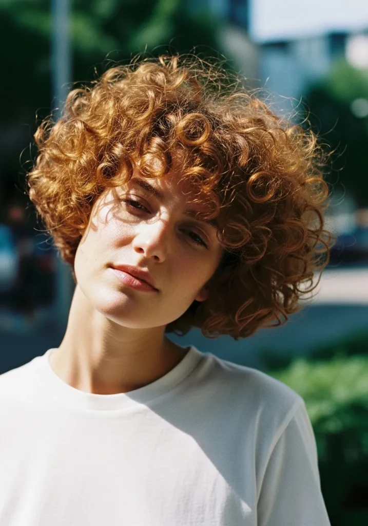 This inverted curly bob sits right at chin level and feels like a little cloud of perfectly springy curls. The shape is gently rounded with slightly shorter pieces at the back that lift the whole look. The curls are tight and defined with lots of natural texture that gives the cut tons of personality. The warm copper color makes every curl catch the light so the whole style looks lively and full.