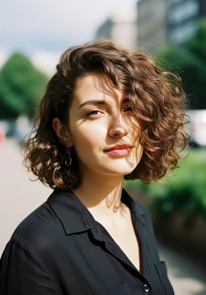 This inverted curly bob sits just above the chin with a gentle forward angle that gives it that chic slightly edgy shape. The curls are soft and springy with a natural pattern that feels carefree. The layers are subtle which keeps the volume light and even. The color is a warm medium brown that catches sunlight in the prettiest way. The curly fringe frames the forehead with those loose tendril pieces that fall just right without looking too polished.