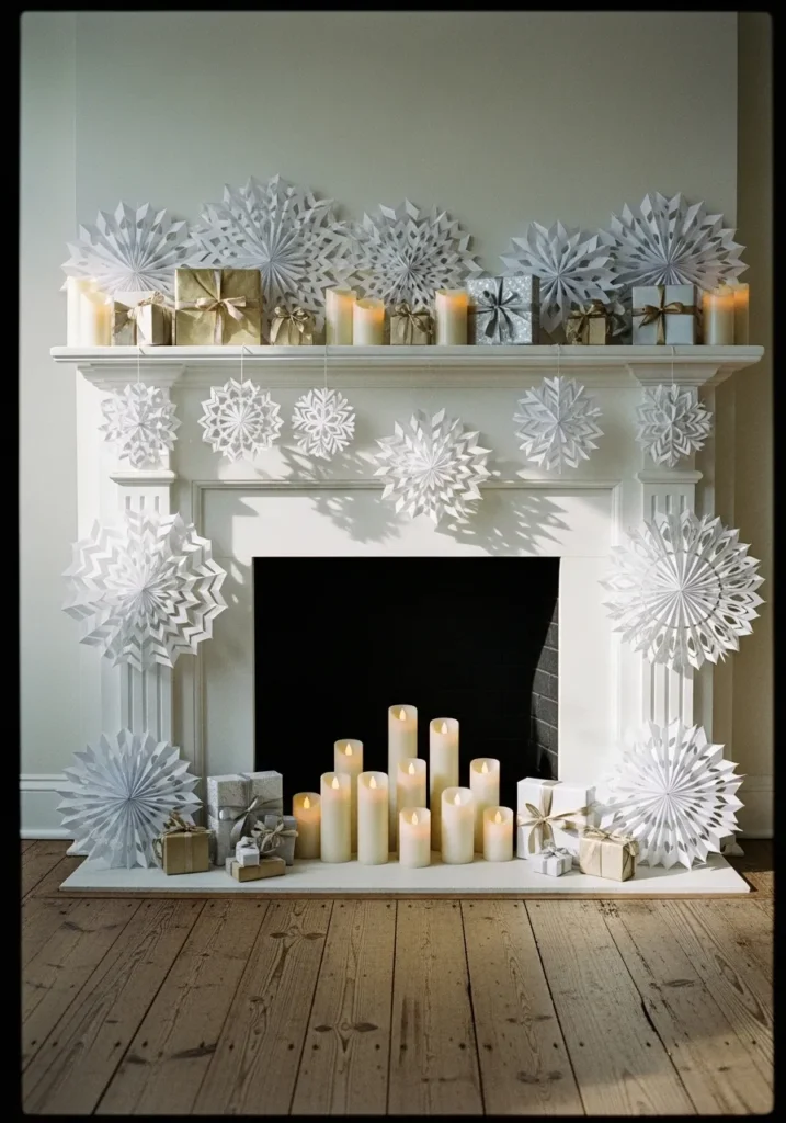 This bright white fireplace becomes a winter wonderland with layers of delicate paper snowflakes and flickering LED candles. Gold and silver gift boxes bring in just the right amount of shimmer, giving the whole display a magical yet calm atmosphere. The balance between light and shadow across the wall makes the paper decorations look almost like real snow in sunlight.