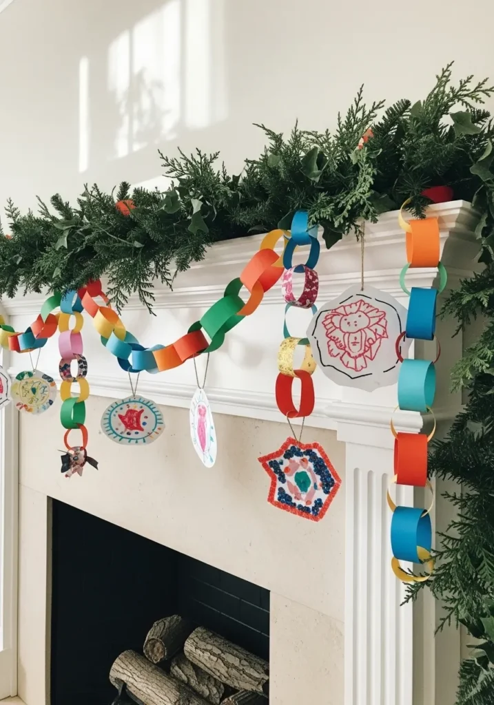 This colorful mantle bursts with childhood energy and creativity. Bright paper chains and hand-drawn ornaments hang over a bed of evergreen garland, creating a joyful mix of color and texture. The handmade feel makes it perfectly imperfect, full of character and personality.