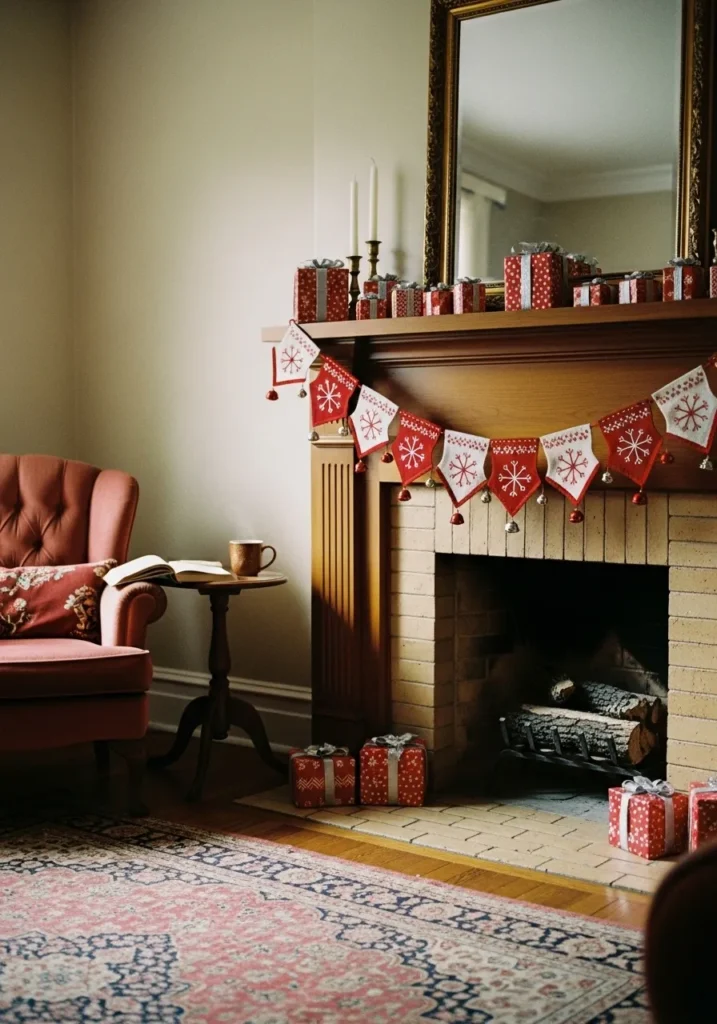 This classic mantle captures timeless Christmas spirit with its red and white banner, patterned stockings, and neatly wrapped gifts across the top. The warm wood tones of the fireplace give the entire setup a cozy, vintage charm that feels straight out of an old Christmas film.
